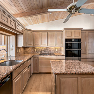 A formal dining area just off the kitchen features custom millwork with etched glass nature motifs and large windows. The kitchen has wide-plank synthetic wood floors, custom cabinetry, a pitched ash wood-beam ceiling with skylight, granite center island and countertops, Bosch cooktop, and Sub-Zero refrigeration.