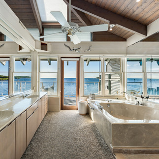 The spacious bayside/poolside principal suite offers cedar-lined his-and-hers closets with custom built-ins, along with a private entry room that can serve as a dressing area, exercise space or lounge before entering the bedroom. The principal bathroom features an ash wood-beam ceiling with skylights, a vanity with dual sinks, an open shower, a sunken spa tub with water jets to soak and enjoy views to the bay, a private water closet and door that opens to the side of the pool deck.
