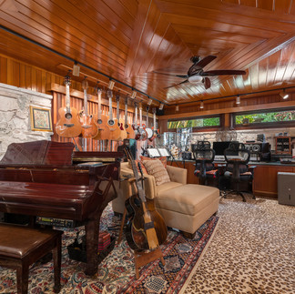 The estate’s elegant private formal living room features marble floors, rich wood-paneled ceilings, recessed lighting, and a coral stone-framed wood-burning fireplace. It boasts direct views of the pool, lush gardens and Biscayne Bay. Adjacent to the living room is a custom, state-of-the-art sound-controlled music studio.